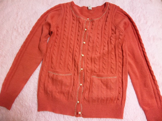 春のファッションアイテム 一目ぼれのカーデ。 濃いオレンジ?朱色?が春らしい♪ ケーブル編みって可愛いよね。 丸首。 ボタンはパールで金縁。 可愛くてテンション上がる♪ でも、ちょっと厚めなのでそろそろ着れないだろうなぁ(^_^;)