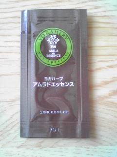 ヨガハーブ アムラドエッセンスのサンプルです。 使い方は 髪をよく濡らした後にエッセンスを手に取り 頭皮に軽く揉み込んで、洗い流さずに 手持ちのシャンプーを使って洗髪。 エッセンスは蜂蜜のような黄色い透明な液体。 このエッセンスを使うと、シャンプーだけより 泡の弾力が違いました。 この泡で、髪と頭皮の汚れをしっかり吸着するらしい。 洗い上がりはさっぱりした感じかな? 実感はあまりないですけど・・・