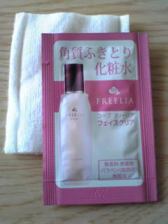 コープ フリーリア フェイスクリアNのサンプルです。 ふきとり用化粧水ということでコットンも一緒に付属されてました。 洗顔後にコットンに含ませて優しくふきとるように使うとのこと。 1.0mlなので量が少ないなと感じましたがサンプルなのでしかたがない。 化粧水をコットンに含ませてふきとると ほんのりコットンに汚れが・・・ 角質がとれたのかな? 肌触りはそこまで変化はないけど。 効果が目に見えるのはいいですね。 この化粧水を使用したあとは保湿はしたほうがよいですね。 配合成分にローズ水とあるので、香りは...