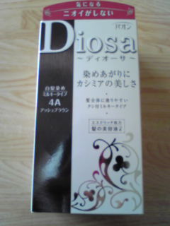パオン ディオーサ ミルキータイプです。 これは白髪染めになります。 カラーはA4のアッシュブラウン(赤みをおさえた色)。 髪の毛はカラーをしていないので アッシュブラウンだと浮かない色だったので 色のチョイスはよかったと思います。 気になるにおいがしないとあるのですが 髪に塗って放置しているときに、やはりにおいはありました。 そのにおいが、夏の草のにおい。 薬品くさいにおいではないけど、ちょっとだけ気になったかな。 髪に塗って、30分と長めに置いて洗いながしたのですが 染めムラはあるけど、き...