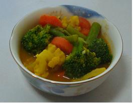 今回は冷凍野菜を使いましたが、ブロッコリー、カリフラワー、それにニンジン、アスパラガスなどを少し入れて、少量のコンソメスープで煮込み、コショウ、カレー粉、ターメリックで味付けします。 身体が温まり、しかもボリュームがある割には低カロリーで、かつ満腹感もあります。 一時期肥り気味だった時に、よくこれを食べていましたら、確実にやせました。 冷え性の方にもお勧めです。