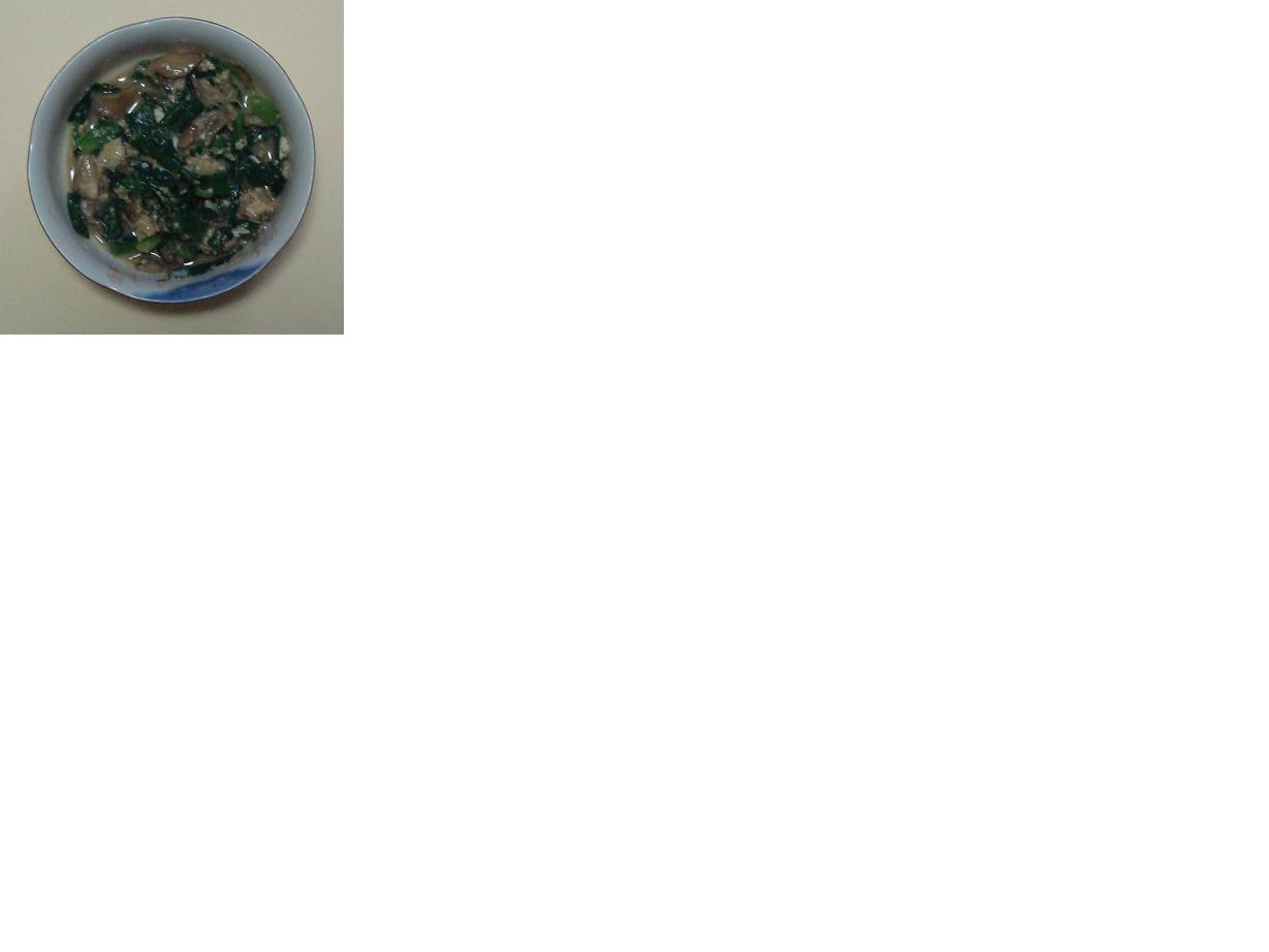 舞茸1パック、ニラ1束を食べやすいサイズに切り、フライパンでいためて、水で溶いた少量の中華ダシを加え、とき卵1個を落として、半熟程度で火をとめます。 勝手に考えたレシピですが、結構ボリュームがありますし、また、元気もでます。^^