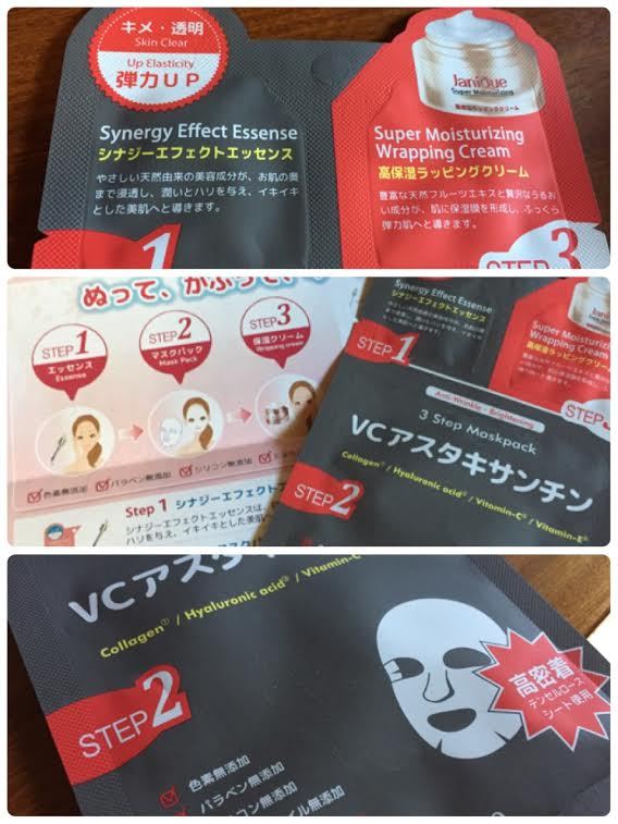 Cencorp Japanさんよりヽ(*・ω・)人(・ω・*)ノ Janique 3ステップマスクパック・VCアスタキサンチンをいただきました♪ Step1〜Step3までが1枚にまとまっているので… 家でも旅先でもお手軽に使うことができちゃいます★ こちらは全3種あるのですが、、、 今回いただいたのは、VCアスタキサンチン☆ こちらはトーンアップしたキメ細かい弾力肌に保ってくれる&疲れた肌にたっぷり水分を与えてくれるので、明るくトーンアップした美肌へ導いてくれるそうです! 先ずは、Step1のシナジーエフェクトエッセンス(。・ω・)ノ...