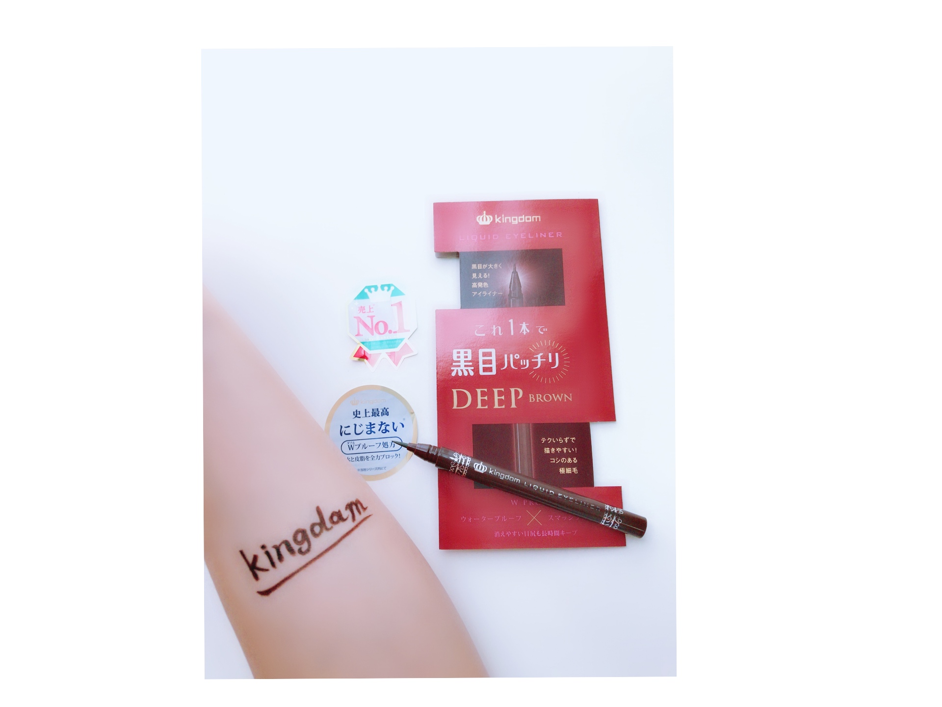 Kingdom リキッドアイライナー 1200円 私は、ディープブラウンを使用しました。 筆先が細くて細くも太くも描きやすく、目のキワがとても描きやすいです。 筆もコシがありしなやかで液も程よく出てくるのでティシュオフせずにそのまま使用しています。 描いた後はすぐに乾き、指でこすってもにじまず落ちにくいです。 発色も良いです。