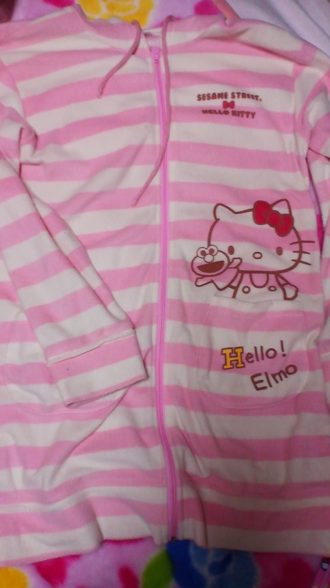 バーゲン戦利品 Kittyちゃんとエルモがコラボのパジャマ! 授乳する為に前開きのパジャマが欲しくて… 大好きなKittyちゃんがあったからママから買ってもらった〜(・o・)ノ 生地はフリース素材で出来てるから凄く暖かいしファスナーがついてるから授乳する時も便利☆ しまむらで上下セットで1990円位だったかな〜!