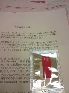 ここから応募したRe美ソープには 残念ながらはずれてしまいましたが 先日、このRe美化粧水のサンプルが届きました。 1回分ですが夏のお助けアイテムにならないかと 使ってみました。 量が多く顔だけでなく首や腕までぬれました。 使った感じたしっとりしています。 ずっと愛用している人の感想はみなさんハリが出てきたと 声を揃えて言われています。 いい商品みたいですね。
