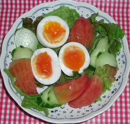 ゆで卵(適度な半熟がウマイっ!)&トマト&キュウリ&レタスのサラダです♪ とってもヘルシーな→「ダイエット・メニュー」ですっ! ポイントは・・・ 適度な半熟ゆで卵がポイントなんですっ(゜−^v)! このサラダ”覆尿結構〜満腹になりますし…(^−^;))) 腹持ちもヨイ↑ですっ 朝食や昼食に最適ですね〜♫♬〜 とってもヘルシーなメニューですっヽ(*´∀`)ノ