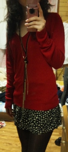トップス...??? ボトム...ORINKARI ネックレス...SHOO・LA・RUE 赤のトップスって、冬に着たくなるんですよねー。 なぜか。 クリスマスが近いから? キュロットはお気に入りのダルメシアン柄。 足元は焦げ茶のタイツにパンプスを合わせました。