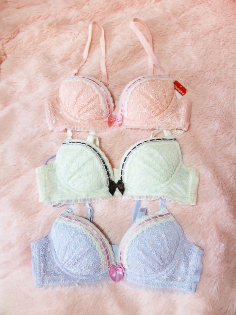 バーゲンの戦利品 AMO'S STYLEで一目ぼれしたブラ♪ コットンレースになっていて、端にはリボン。 とっても可愛かったので、色違いで3つ買っちゃいました。 特に白い生地にグリーンのレース茶色いリボンがお気に入り。 3,900円が3,000円に値下げしていて、 さらに3枚以上で10%オフ。 8,000円円で買えちゃいました〜(*^ω^*) しかも、彼に払って貰ったっていうw