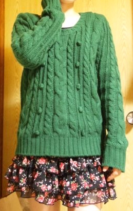 バーゲンでゲットした緑のニット。 モコモコでかなりあったかい。 小花柄のフリフリスカートを合わせました。 デニムだとクールな感じ。