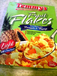 Temmy's パイナップル&パパイヤの入ったシリアルです。 ビタミン豊富、コレステロールとトランス脂肪酸フリーな製品。ついでに98%ファットフリーでダイエット向きです。 甘みがほぼ感じられないことと、乾燥パパイヤとパイナップルがとても固いので、少し食べにくいかなぁという食感です。