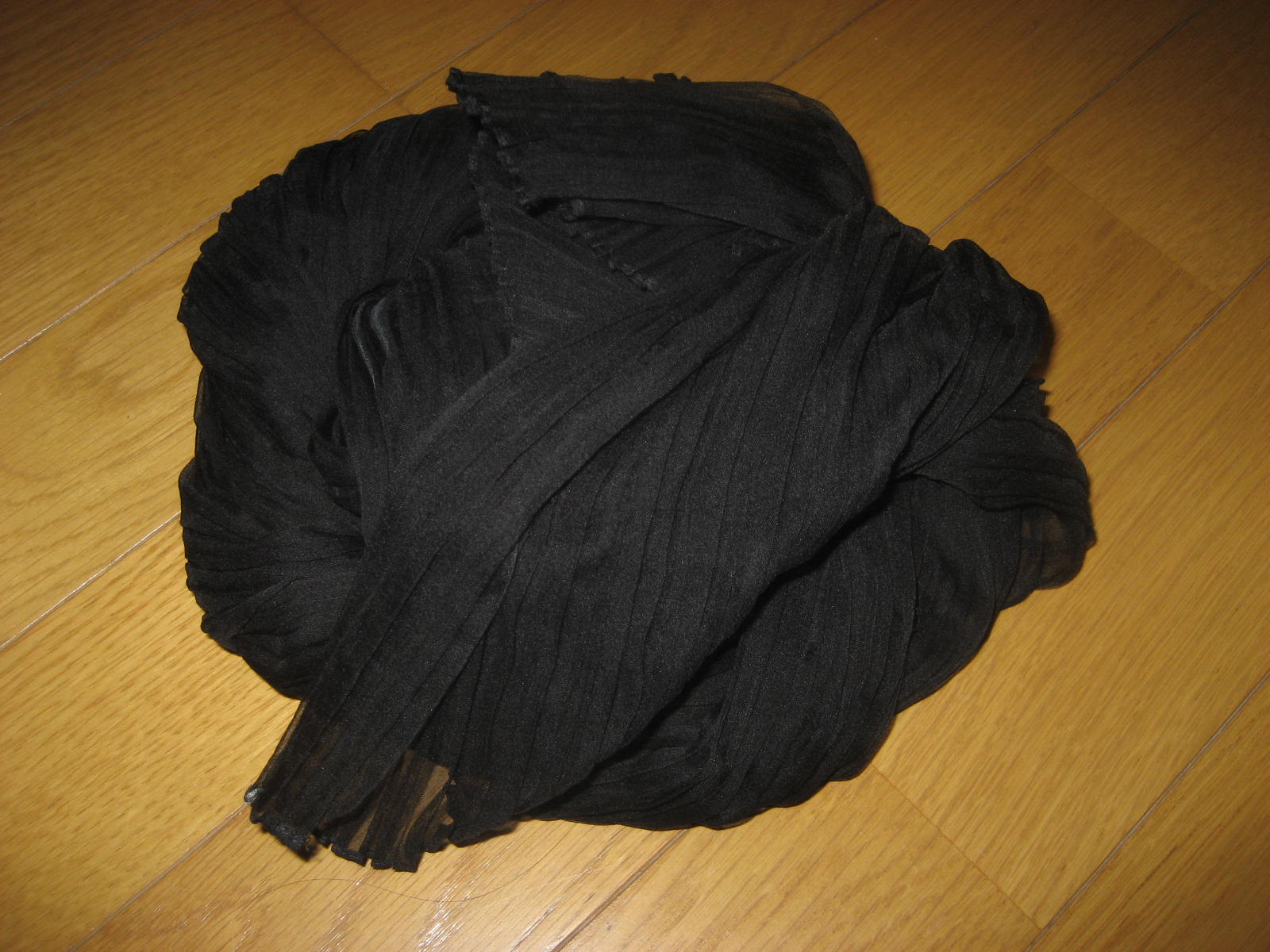 黒の薄手のスカーフです。 無地の黒というシンプルなデザインなので合わせやすく、使い勝手がよいです。生地が薄いので秋から冬にかけて長く使え、重宝します。 ジーンズに合わせ、ねじって巻いたり、ふわっとさせてエレガントしたり出番が多いアイテムです。