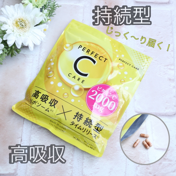 こちら1日4粒でビタミンC2000mg摂れるサプリメント。 120粒入りの、大きめな袋。 パウダーのビタミンCも飲んだことありますが・・ カプセルの方が、パウダータイプと違ってむせ込んだりしないし、無味で摂りやすいですね。 ただ、粒が少し大きめかな・・ するっと飲めて気軽に続けられています。何回かに分けても飲める。 後で胃が浮くようなこともありません。 通常ビタミンCは摂ったら、すぐ排出されちゃうイメージ。 でもパーフェクトⅭケアはビタミンCを油脂でコーティングしているので、カラダの中でゆっくり放出し...