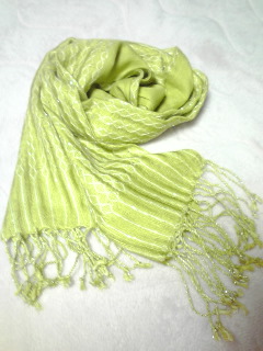 薄いきみどり色の春用ストール。 ラメ糸が織り込まれているのでキラキラしてとっても可愛いんです♪ フリンジ部分もキラキラ♪ ストールは、シンプルなコーディネートのポイントになるのでたくさん持っています! 春は主にパステルカラーを選びます。顔色がパッと明るくなるので是非巻いてみてください♪