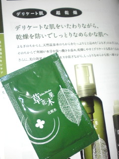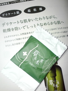 【よもぎ】 デリケートな肌をいたわりながら、乾燥を防いでなめらかな肌に整えるというコンセプトだそうです。 花粉症で過敏に傾いてる肌にイイんじゃないか?と思い、試供品をいくつか頂きました。 まずはこちらの緑色の固形石けん。 肌への負担が少ない天然アミノ酸ベースの弱酸性洗顔石けんです。 濃い薬草の香りがします。 ほわほわと泡立ち、しっとりして洗顔後のつっぱりは感じませんでした。 すでに花粉症状が現れてきていて、まぶたなど皮膚の薄いところが過敏に反応するのですが、こちらは刺激にならず 潤いも...