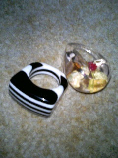 ◎春のファッションアイテム◎ 白と黒のストライプのリングと お花が埋め込んであるクリアリングです。 チープだけど、オモチャっぽくて可愛いので、 一目惚れして買いました。 私はゴテゴテしたリングより、こういうオモチャっぽい リングに惹かれたりします。 なんでだろうか。 白と黒のストライプのリングはわりかし使いやすそう。 お花のリングは春っぽいです。