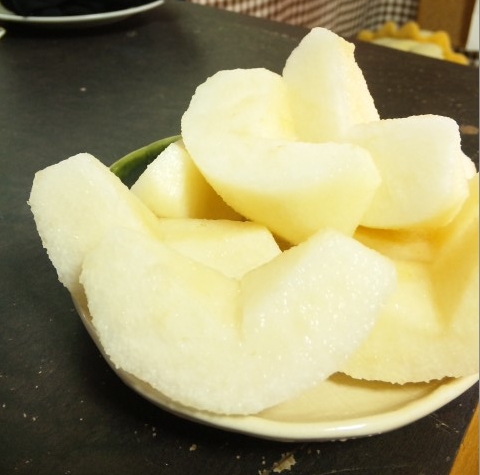 みずみずしくて美味しい梨。 水分と食物繊維が比較的多く、 便をやわらかくする「ソルビトール」という糖を含んでいるので 便秘予防に効果があるんだって。 カロリーは100gあたり約50kcal。 ヘルシーだし利尿作用もあり。 ちなみに枝側よりもお尻の部分が甘いらしいです。
