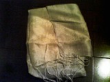 春のファッションアイテム、シルクのスカーフです。 光沢があるので顔周りが明るく見えるので、きれいな色の物を巻くようにしています。ツヤ感があるので、フォーマルのときにも使えて便利です。色は薄いグレーです。首ぐりが寒いときはすっと巻いて出かけます。