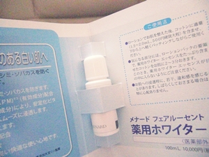 私の真冬のレスキューアイテムを紹介します! サンプルでいただいたメナードのフェアルーセント 薬用ホワイターです。 冬場にちょっと油断して日焼けしてしまう、ということを 防ぐためにも普段の美白ケアでメラニンの生成を抑制する ために使います^^ 顔になじませると、ほわっとじんわりと温かくなる気が しました。肌の弱い方には向いてないのかもしれません。 保湿もできるし、美白もできるので便利^^