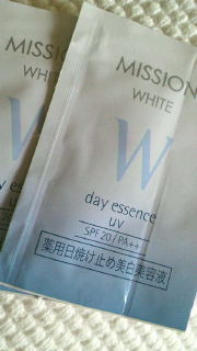 MISSION WHITE デイエッセンス UV です。 <薬用日焼け止め美白美容液> SPF20 PA++ エッセンスタイプなのでなじみやすく付け心地が軽いです。 塗ったあとお肌を確かめてみると、柔らかさを保てていて ギシギシしないしお肌が疲れる感じもなし。 フローラルシトラスの香りは、 塗っている時にすごく良い香り〜 化粧下地としても○。 これだったら日焼け止めが苦手な方でも使えそう ! !