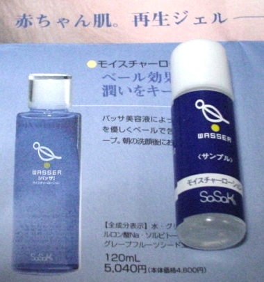 http://www.wasser.jp/product/product.html サンプル:5ml 現品:120ml 5040円(税込み) このメーカーの朝のラインです。 普通の水のような透明な液体ですが、つけるとしっとりします。 乾くと水分が足りないような半端な感じがしました。