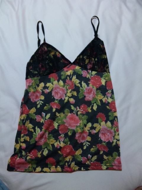 この夏のバーゲンの戦利品 秋にも使えそうな色合いの花柄が気に入りました。 バストの部分はレースです。 セクシーな感じがお気に入り。 30%オフで2800円くらい。 インナーとしてまだまだ大活躍しそうです。