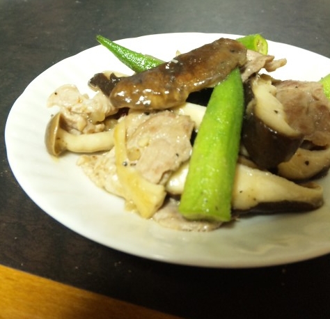 豚スライス肉...250gくらい しめじ...1袋 しいたけ...大き目の4つ おくら...7本 **ソース** チューブのガーリック...1cm 粗びきペッパー...多め 白ワイン...150cc チキンコンソメ...1個 塩...適量 ソースの材料を混ぜておく。 フライパンに油をしき、豚スライスとおくらを炒める。 火が通ったら、しめじとしいたけを加え炒める。 キノコに火が通ったらソースを加えて炒める。 しいたけを大きめに切ったのと、 ミニおくらを丸々使ったので、 食感があってよかったですー。 ヘルシーだからダイエットにもオス...