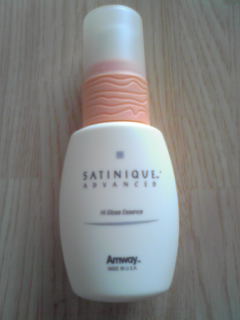 アムウェイ サテニークアドバンスト ハイグロス エッセンスです。 洗い流さないトリートメントで こちらはプッシュ式です。 髪を洗った後にタオルドライをした後に少量を手にとって髪になじませます。 乾いた髪にも使えますが、わたしはタオルドライ後に使ってます。 髪につけるだけで洗い流さなくていいというのはラクですね。 髪がしっとりするのでいいです。 でも、大量につけてしまうとベタベタになるので注意は必要。