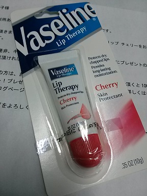 キレイナビさんのプレゼント交換でいただきました。 ベースはヴァセリンなので安心。 少量でよく伸び、べたべたせずに潤います。 これだけでも良いし、口紅のベースとしてもすごく良いです。 チェリーの香りとほんのりとした甘みがあって、つけるのが楽しみになるリップクリームです。