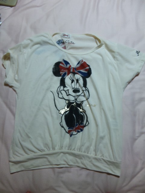 この夏のバーゲンの戦利品 ちょっと大きめTシャツ。 プリントはミニーちゃん。 カジュアルにダボっと着こなします。 500円くらいだったような。