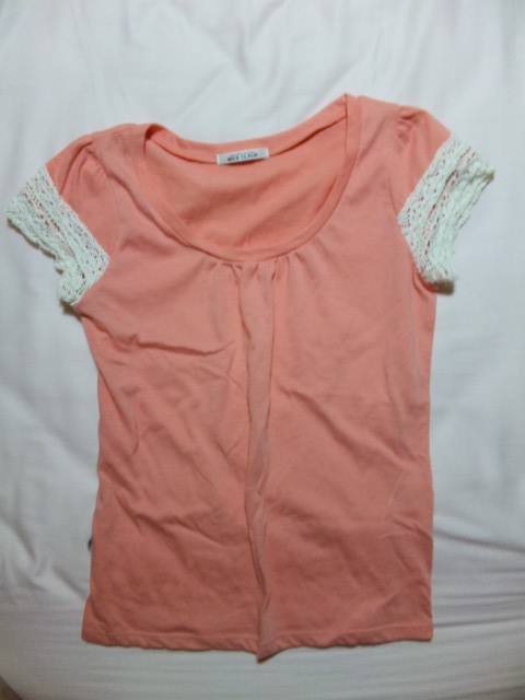 この夏のバーゲンの戦利品 肩のところがコットンのレースになってます。 柄は特にないので重ね着でよく着ます。 きれいなサーモンピンクがお気に入り。 たぶん1,000円くらいでした。