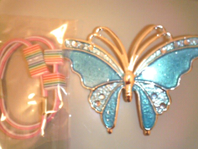 【 バーゲンの戦利品 あまり使えなさそうなアクセサリー】です。 店でアクセサリーのバーゲンをしていたのでついつい無駄遣い・・・。 蝶のヘアクリップが可愛いかったので購入しましたが、 蝶の飾りがものすっごく大きくて買った後に後悔・・・・。 しかもクリップの部分がものすっごく小さくて髪に挟めません・・・。何で飾りはこんなにデカイのにクリップの部分は小さいんだろう? 画像に蝶のクリップと一緒に写っているヘアゴムは店員さんがオマケでくれました!! これから使う予定です。 ヘアゴムは使えそうだから良い...