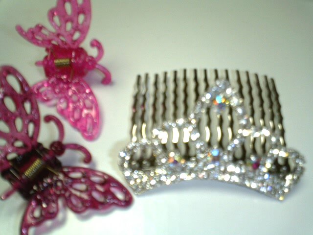 前回、『あまり使え無そうなアクセサリー(蝶のヘアクリップ)』(あまりどころか実際は性質上、全然使えません)を購入した時に学んだことを生かし、今度は同じ店の同じバーゲンで使えそうなアクセサリーを購入!! これぞ【 バーゲンの戦利品 !!! 】蝶のミニクリップ(ピンクとワインレッド)とお姫様風ティアラコーム!!!(画像では見えにくいと思いますが結構キラキラしてます。) 嗚呼、同じ店の同じバーゲンに1日に2度も行った事は無駄ではなかったのね・・・。 店員さんは『また来たのか』という顔をしてましたが...
