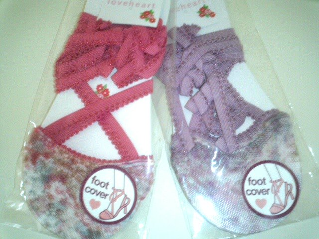 勝負アイテム 「フットカバー」です。 お色はピンクと紫です。 知ってる方もいるとは思うんですが、ゴスロリファッションやロリータファッションをしている方がよく足につけてるやつです。 ハイヒールにも合いますし、中々可愛い感じがしたのでネットにて購入して見ました。 バレリーナみたいに足に結んでみてます。 コレ1つあるだけで足元が可愛い感じになりますし、ちょっと女の子らしい足元になるような気がするんです。 沢山買って自分で飾りをつけてみたりして遊んでます。 薔薇の花の造花を縫い付けたり、さくら...