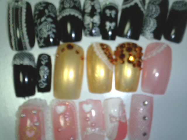 バーゲンの戦利品 ネイルグッズです。 画像はそのネイルグッズを使って当方自らが製作したネイルです。 ちなみにネイルを作ったのは初めてです。 (マニキュアを塗ったのも初めて) ・ネイル50本 ・ハート型に穴の開いたネイル2本+普通のネイル10本 ・マニキュア(色:黒) ・マニキュア(色:薄ピンク) ・マニキュア(色:白) ・マニキュア(色:ブラウン) ・マニキュア(色:ゴールド) ・3Dレース ネイルシール ・キュートネイルシール(王冠等の繊細なデザインのネイルシールです。) ・ジュエリーネイル...
