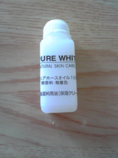 北海道純馬油本舗 ピュアホワイトのお試しサイズです。 馬油です。 今は季節が暖かいためかとろみのある液状になっています。 香りがないので使いやすいです。 少量でしっとりはしますが、つけすぎるとテカるかな? オイルなので仕方ないと言えばそれまでかもしれませんが・・・