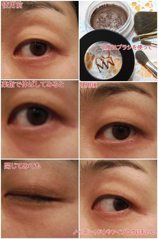 モニターで使用しました。 私が使ったのはBR380の穏やかで温かみのある印象のショコラブラウンですが、赤みのある茶色の見た目です。 ところがこの発色がよかった。まずは同じ色でも薄い色から濃い色をそろえる方がいますがそれがいらないのがこのアイカラーなのです。 と、いうのも朱肉のような作りなのに、指につけたのが全部肌について発色し、使った指を見ますと色が残っていないのがこの商品の特徴です。 しかもつけた色は角度を変えると発色が違うのでつけ方をブラシを変えることにより濃く眉に書いたり、ふわっと瞼...