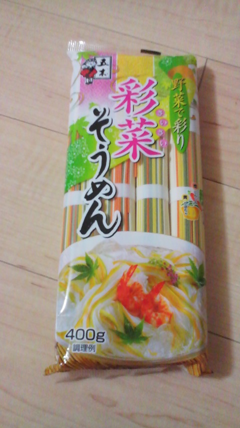 夏バテ対策 五木食品の彩菜そうめん☆ 夏と言えばそうめん! 暑い日や食欲がない時は結構そうめんを食べます。 このそうめんは、麺が緑(ほうれん草)・橙(にんじん)・黄(かぼちゃ)と色も鮮やか〜!! 2才の子供は、普通のそうめんより、このそうめんの方が良く食べてくれます。