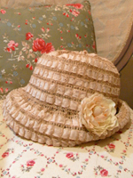 夏らしい、綿素材の帽子です。アンティークな感じの淡いピンクです。コサージュは別個につけたものです。これをかぶるだけで、シンプルな服装でもとてもおしゃれな感じになります。綿素材なので涼しいです。顔は日焼け止めを塗れるけど頭(頭皮)は塗れないので帽子は重要なアイテムですが、いかにも紫外線対策シテマス的な帽子ではつまんないし夏もおしゃれしたいから、可愛い帽子を選びました。