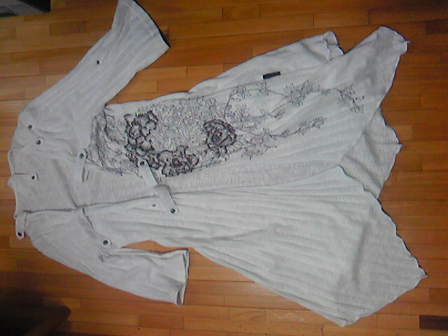 超個性的なデザインのカーディガンです。 ひざぐらいまでの長さがあります。 すその方はマーメイドドレスのようにヒラヒラしたデザインになってます。 襟元がベルト通しのようになっていて、スカーフを通して着るとさらに個性的になります。いろんな色のスカーフに付け替えて遊んでみるのも楽しいです。 ジーンズ、スカート、短パンなど、いろんなスタイルに合います。 夏らしいやわらかな素材なので、着心地はとても良いです。