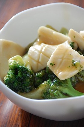 イカの下処理をして、格子状に軽く包丁を入れておく。ブロッコリーは子房に分け、少し堅めにゆでておきます。 サラダ油を熱したフライパンでブロッコリーを炒め、イカを入れサッと炒めたら、オイスターソース、醤油、鶏がらスープの素、みりん、片栗粉、水を全部混ぜてから入れる。 加熱して好みのトロミが付いたら、ゴマ油を回しかけて出来上がり!