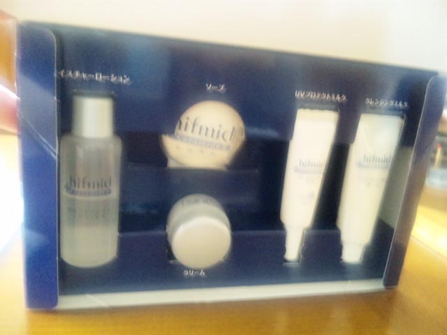 小林製薬のヒフミドです。 クレンジング、ソープ、モイスチャーローション、クリーム、 UVプロテクトミルクが入っていました。 保湿に優れていてとても、しっとりと潤いました。