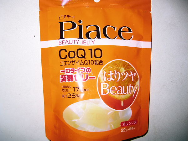 美容にいいとされるコエンザイムQ10が配合されたこんにゃくゼリーです。 一袋、6個入りです。 肌にもお腹にも良さそうで、安売りしてたのもあって購入してみました。 味もオレンジ味でおいしいし、1個あたりのカロリーが17kcalなので、ダイエット中に小腹がすいたとき食べるといいかもしれません。
