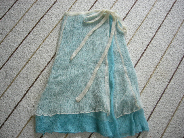 秋冬アイテム〜その9〜 モヘアで編んだスカートです。 水色の上にホワイトを重ねてあり、巻きスカートになっています。 スカートの裾にはビーズが縫い付けてあり、ディテールにもこだわっています。 優しい感じで、とても気に入っています。