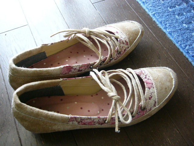 秋冬アイテム〜その5〜 一目惚れで買いました。 5900円とちょっと高めですが、あまりに可愛かったのでフンパツしました。 革のような素材なんですが、ベージュにピンクの柄がポイントです。 紐も同じ素材で、ちょっと結びにくいんですが可愛いでしょう? 中敷きもドット柄で可愛いです。 ヒールは低めでウッド調。 歩くととてもいい音がします(笑)