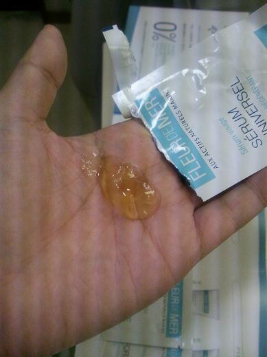 手のひらに出ているのは、「フルールドメール」というブランドの美容液 「ユニバーサルセラム」です。 「フルールドメール」は肌と自然にやさしい処方です。 ブルターニュの海洋水を体液に近いバランスに調整してミネラル豊富なシリーズになっています。 「ユニバーサルセラム」はゲル状の美容液で、かなり粘度があります。 10分〜20分すると、ペタペタ感は落ち着き、一日中うるおいが続きました。