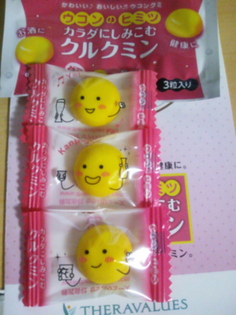 かわいい個別包装のクルクミングミ♪ 飲み会にバッグに入れていくのにちょうどよいかな。 クルクミンは二日酔い防止やポリフェノールとして体ににいいんだけど、それだけじゃなくって、このグミマンゴー味でとってもおいしいです。 おいしくてあとひきますね。 独自の技術により、クルクミンの吸収が、こんなにちっちゃいのにほかのサプリやドリンク剤よりとってもいいんだそうです。