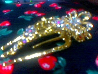 輝き方がキラキラでとてもきれいなスワロフスキの髪留め。 一本に髪を束ねてその上にはめる使い方です。 上品な感じで気に入っています。 いつもならシルバーの枠の物を買うのですが、金色の枠の方が美しかったのでこちらを選びましたが大正解。 これからは金色のものにも挑戦していこうと思った逸品です。