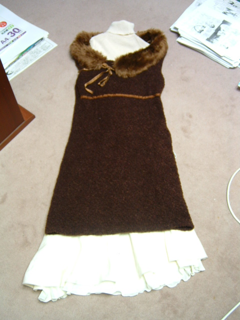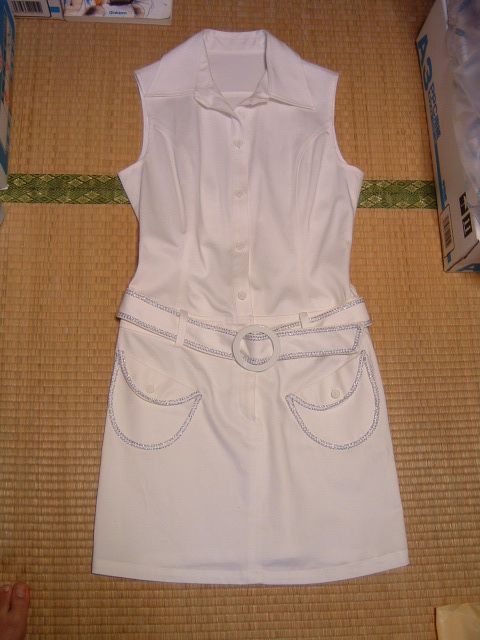 バーゲンの戦利品第2弾 その9 これも一目惚れでした。私は切替が下の方にあるワンピースが好きで、このワンピはまさに好み!丸いプラスチックのベルトのバックルも可愛いし、ポケットとベルトのシルバーラメのパイピングが最高に良い味出してるのよ〜。1500円の大特価で買えて満足満足☆ちょっと丈が短いんだけどね。。。