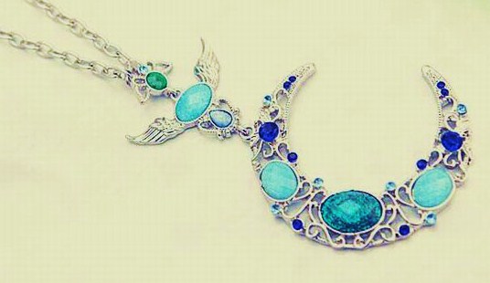 プチプラアクセサリーを、バーゲン価格で購入した戦利品です。 もともと安い値段から、更にお値引きされて とてもお得に購入できました。 繊細な模様の月とそのうえの天子の羽に ターコイズとサファイヤのようなビーズがあしらわれていて 自分の趣味に、とても合っています。 プチプラアクセ特有のチープさも気に入っています。 大振りで胸の辺りまである長さのペンダントなので とてもインパクトがあり、 コーディネートが寂しいときに、このネックレスを選びます。